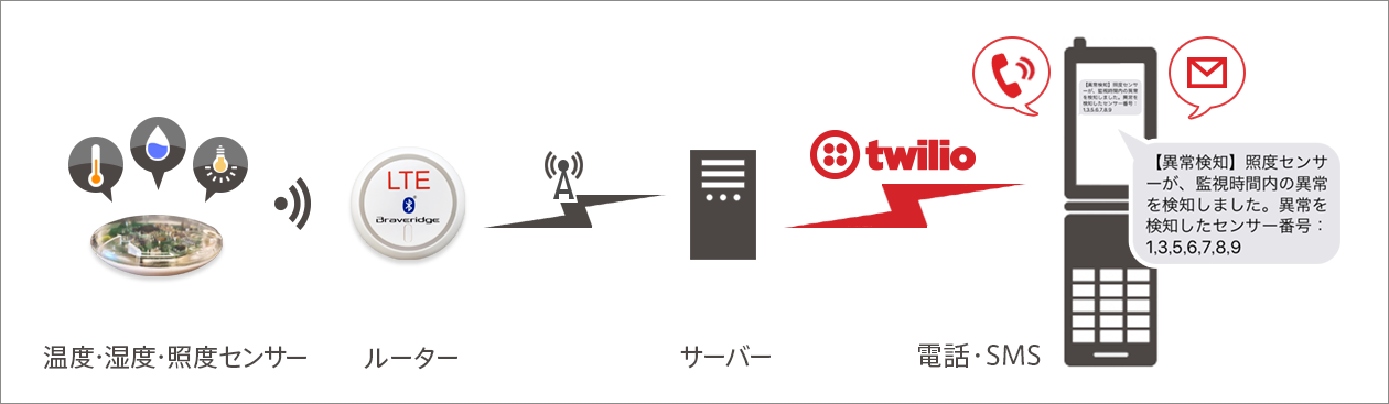 仕組みはとてもシンプルです。ブレーカー落ちによる電照切れやビニールハウス内の気温変化をセンサーにより感知します。その後、設定値を超えるとクラウド電話APIサービスTwilio(トゥイリオ)により、生産者の携帯電話に電話・SMSで通知します。また気になるタイミングでシステム側に電話をかけることによりリアルタイムで照度・温度の値を知ることも可能です。