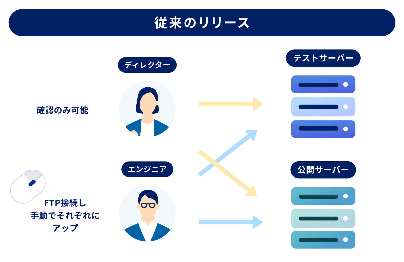 SmartRelease Uを活用することで、テストサイトで制作したコンテンツを、簡単クリック操作で公開サイトにリリースできます。従来のようなFTPで公開サイトにファイルをアップロードする作業が不要 になり、リリース作業が自動化されます。