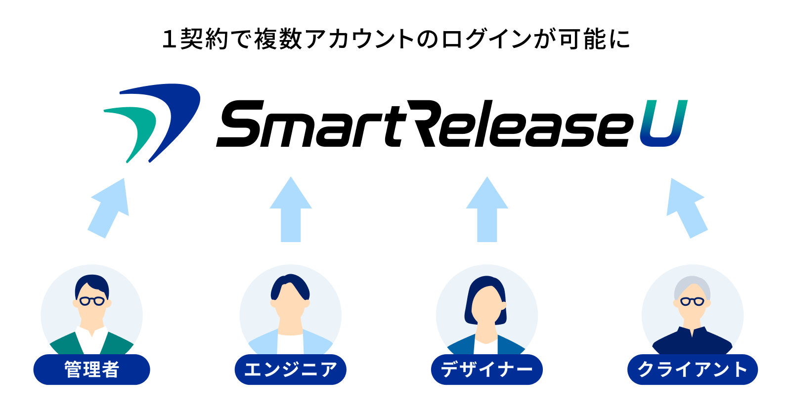 今後、マルチアカウント・ロール管理機能の追加を予定しており、1契約で複数アカウントのログインが可能になります。ディレクターやWebマスターなどの管理者が、案件に関わるデザイナー・エンジニア・クライアントなど、それぞれの役割に応じたアカウントを付与することができます。また、アカウントごとにアクセス権限の設定ができるため、SmartRelease Uで制作案件を一元管理している場合においても、安全に活用できます。